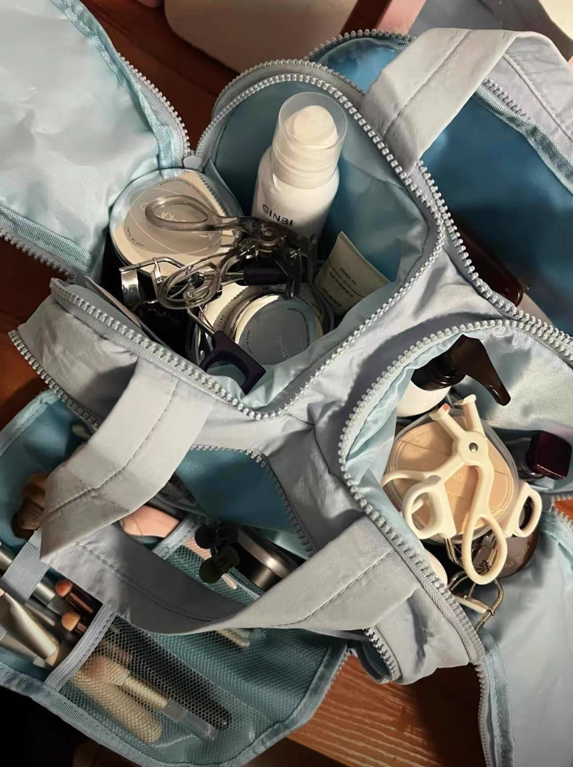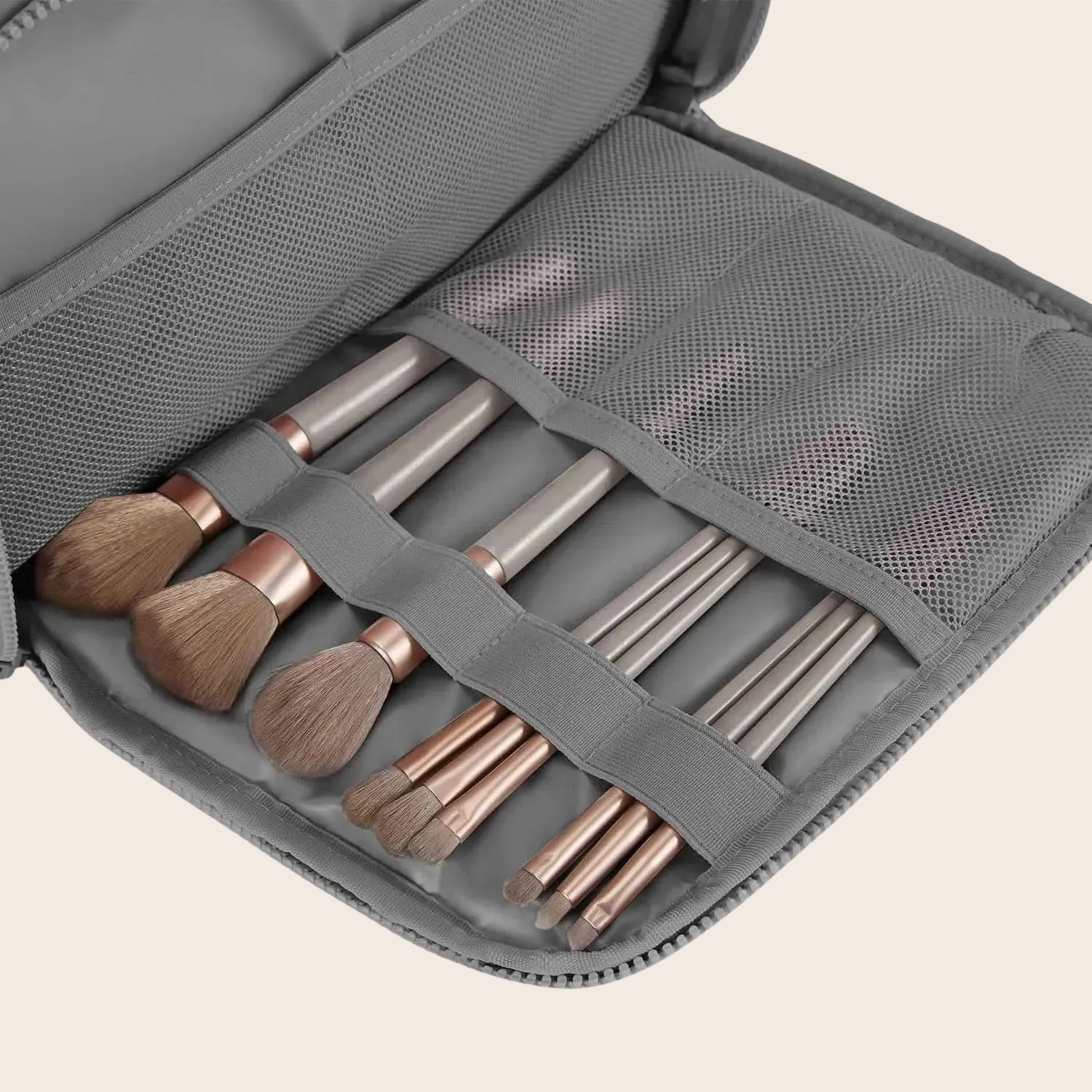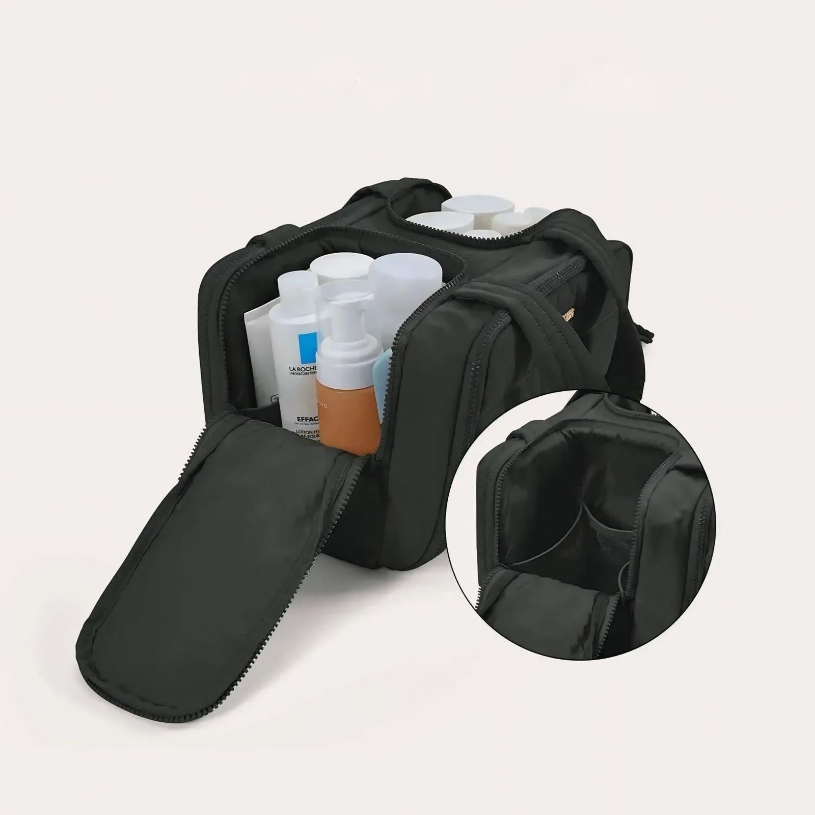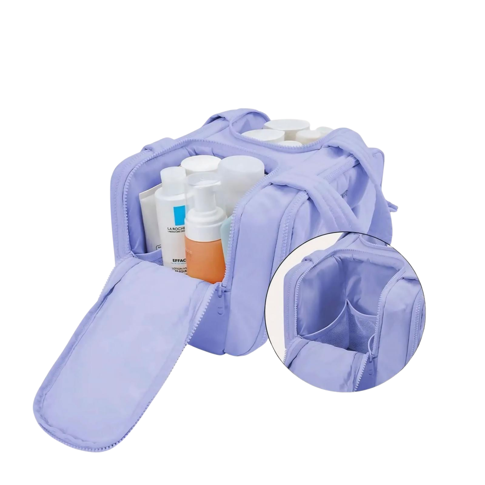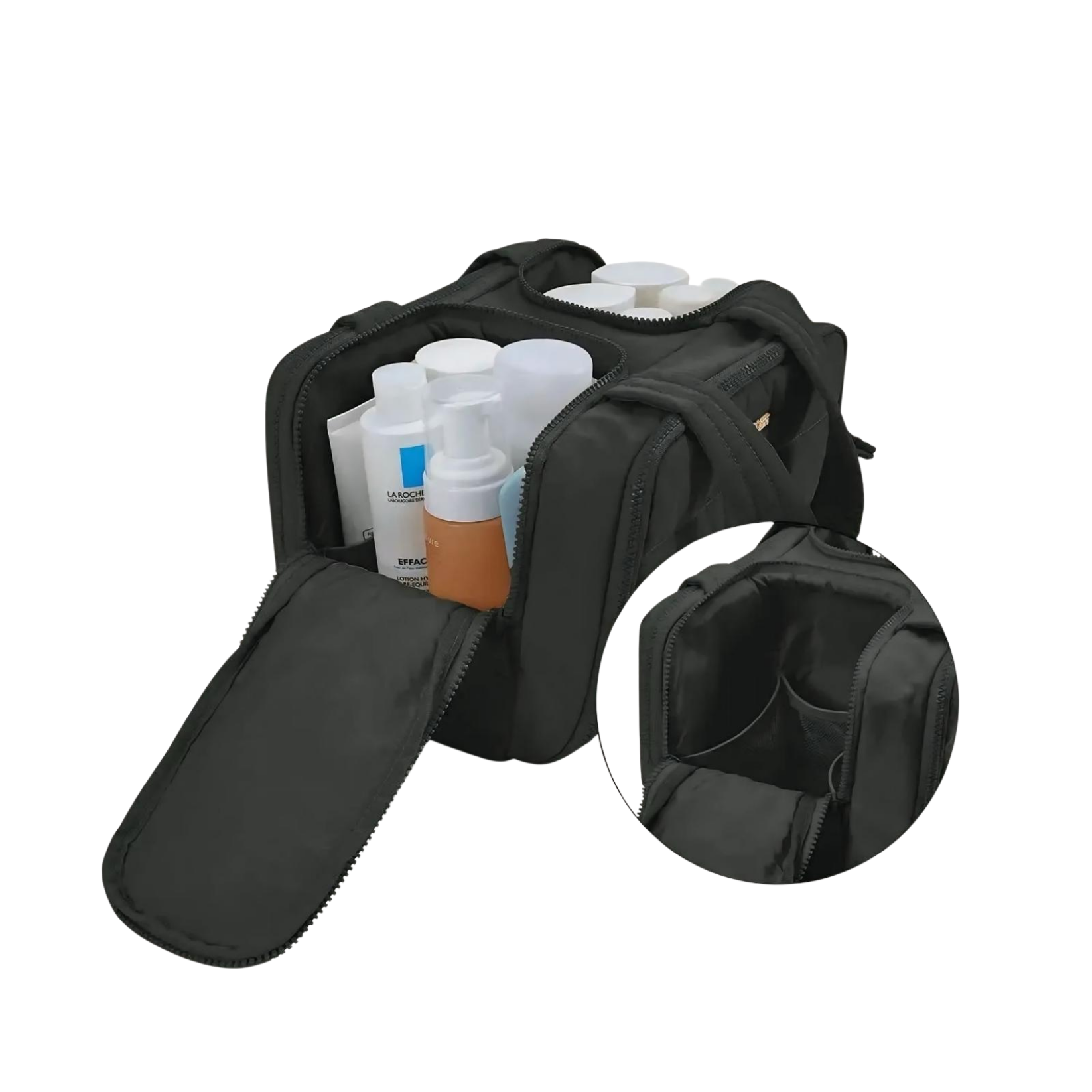 Fırçalarınız, diş fırçalarınız ve küçük eşyalarınız için esnek bantlı bölmeler. Su geçirmez yapısıyla ıslak ve kuru eşyalar ayrı durur, her şey yerli yerinde kalır.